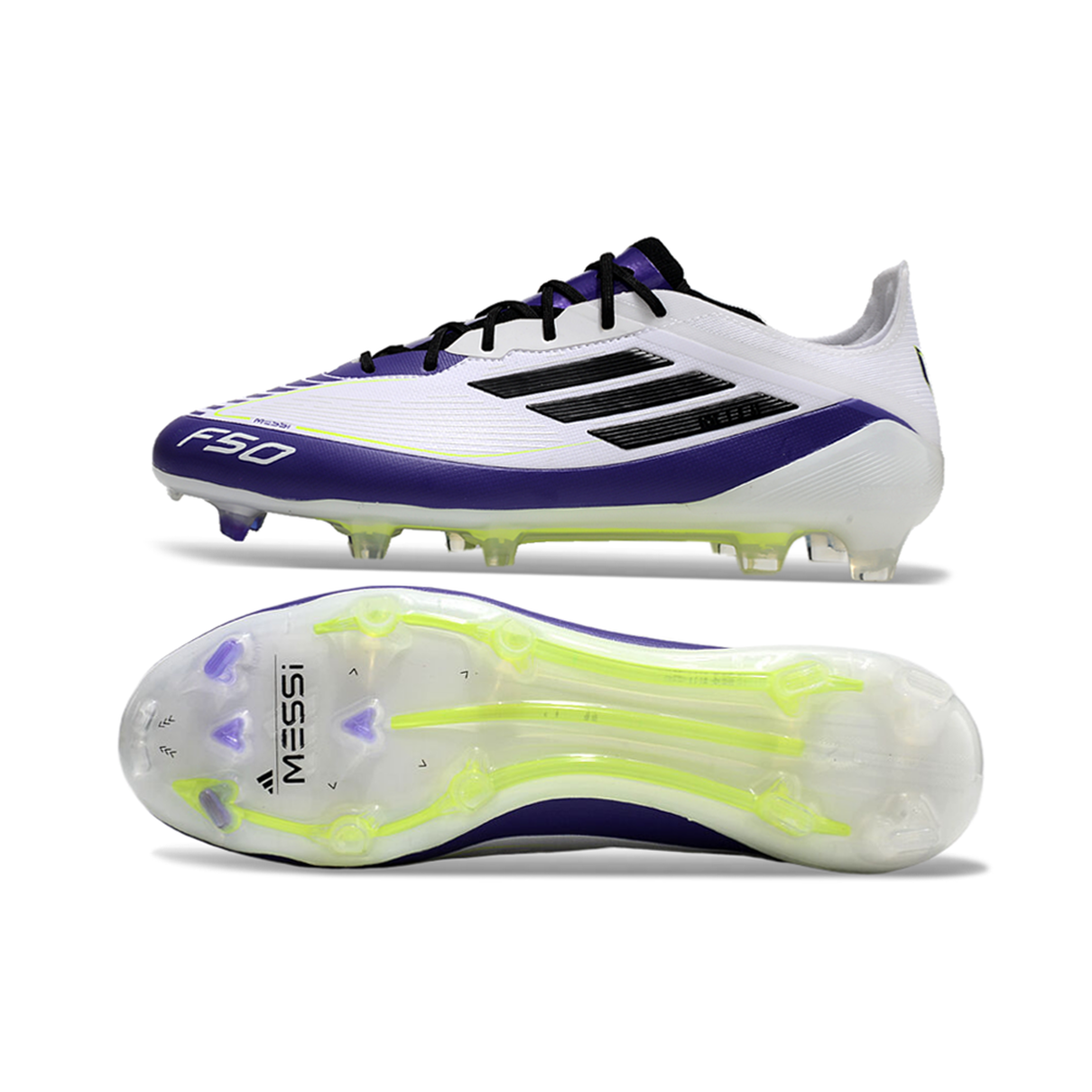 Leve seu jogo a um novo patamar com a Chuteira Campo Adidas F50 FG Messi, parte da coleção "Triunfo Estelar" nas cores Branca, Roxa e Verde. Inspirada no talento e na agilidade do craque Lionel Messi, essa chuteira é perfeita para jogadores que buscam velocidade e controle em campo.