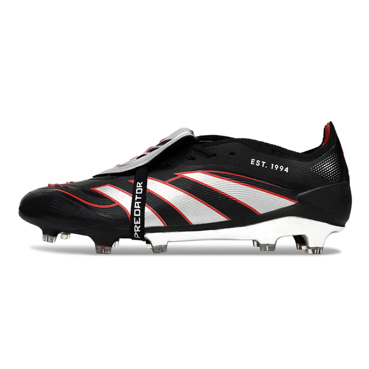 A Adidas Predator FT 30 Elite FG traz o equilíbrio perfeito entre inovação e estilo clássico. Seu cabedal em preto com detalhes em branco e vermelho oferece visual marcante, enquanto a tecnologia de controle garante toques afiados e jogadas precisas.