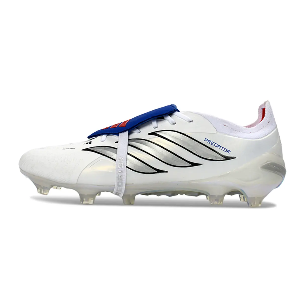 A Adidas Predator Tongue 26 Elite FG foi desenvolvida para jogadores que buscam controle, precisão e performance elevada em campo. Parte da reconhecida linha Predator, este modelo combina tecnologia avançada, conforto ergonômico e um visual sofisticado nas cores branco, prata e azul — perfeito para quem busca estilo sem abrir mão da performance.