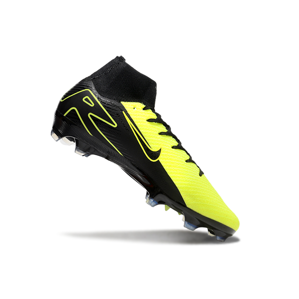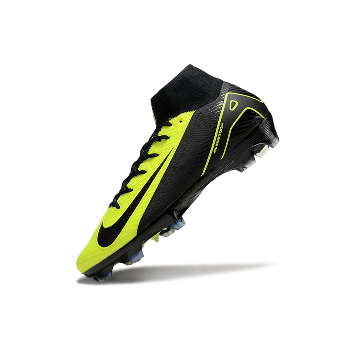 A Nike Air Zoom Mercurial Superfly 10 Elite FG na combinação preta e verde traz um visual sofisticado e imponente para os jogadores que buscam velocidade e desempenho de elite nos gramados.