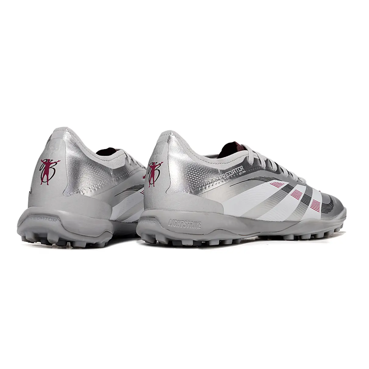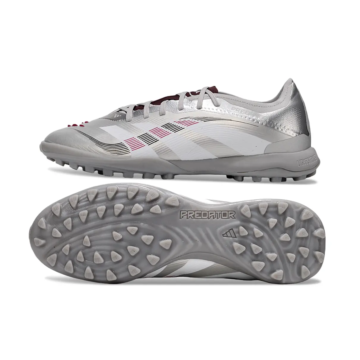O prata metálico transmite modernidade e destaque, enquanto os detalhes em vermelho adicionam intensidade e atitude. Feita para gramados sintéticos, combina tração, controle e conforto.