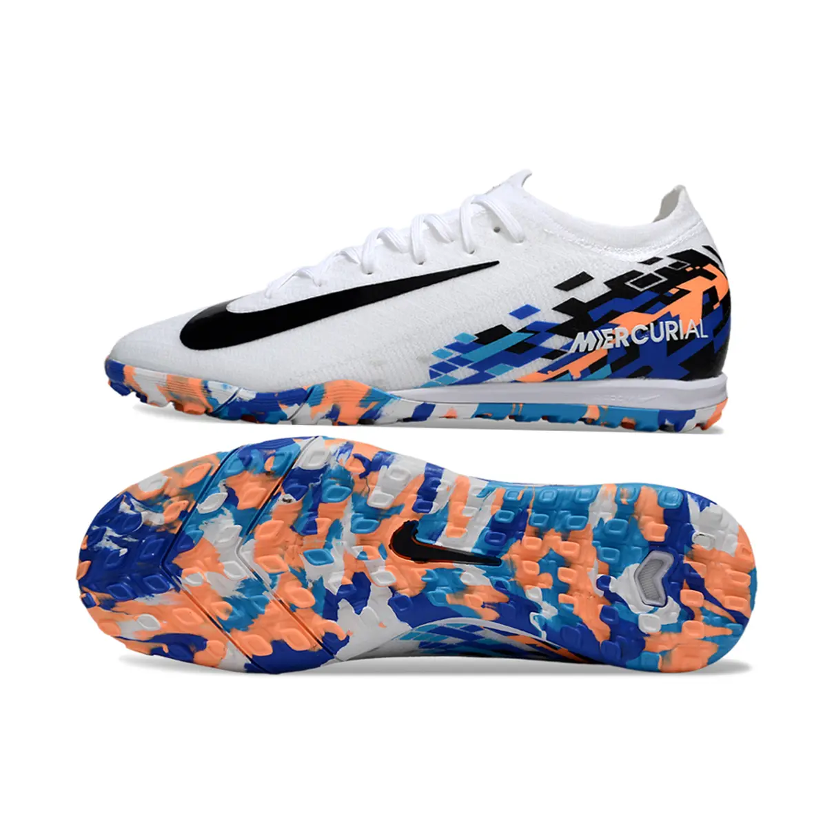 A Nike Air Zoom Mercurial Vapor 16 Elite TF – Branco, Azul, Laranja e Preto é a escolha perfeita para jogadores que vivem o jogo em alta rotação. Nesta versão com visual marcante e multicolorido, ela oferece velocidade, controle e tração de elite para partidas em gramado sintético.